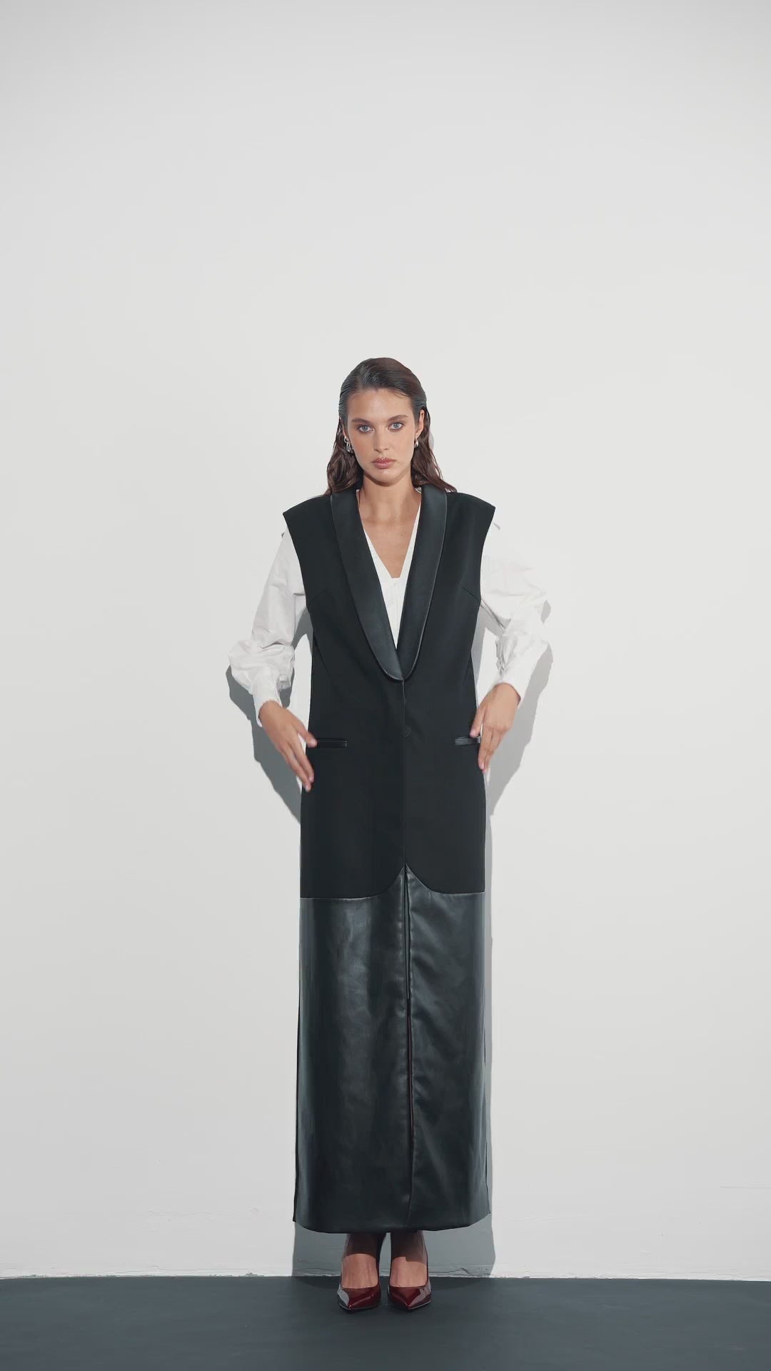 Подовжений жилет, створений із поєднання костюмної тканини та якісної екошкіри. Чіткі лінії й витягнута форма візуально струнко підкреслюють силует, а чорний колір додає йому універсальності та сили.