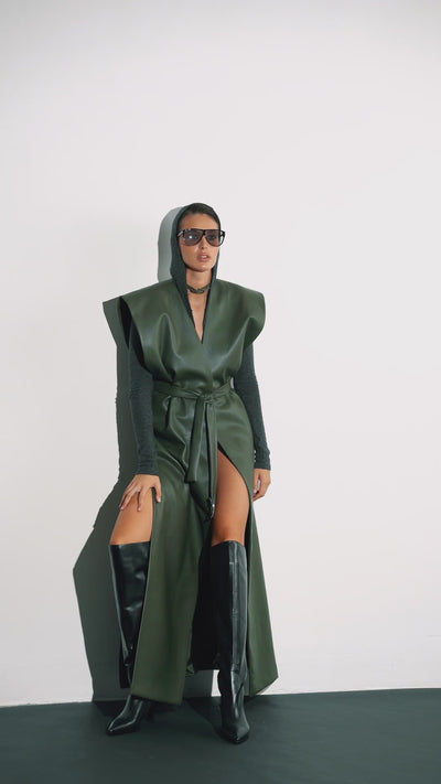 Caleon виконаний із якісної екошкіри у глибокому зеленому кольорі. Модель довжини максі має пояс, що зав’язується, дозволяючи підкреслити талію. Щоб підібрати ідеальну довжину, достатньо вказати ваш зріст.