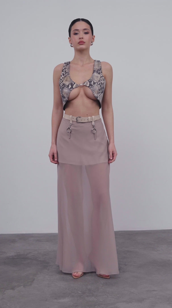 Ця спідниця поєднує ключові тренди сезону: прозору текстуру та бежевий відтінок.