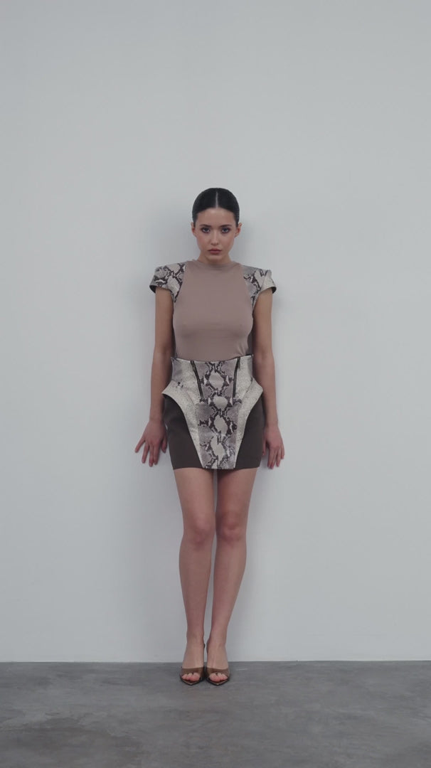 Поєднання фактурної шкіри з принтом змії та костюмної тканини в теплих шоколадних тонах формує ідеальні пропорції — акцент на талії, підкреслення стегон.