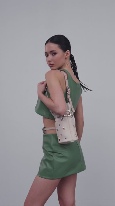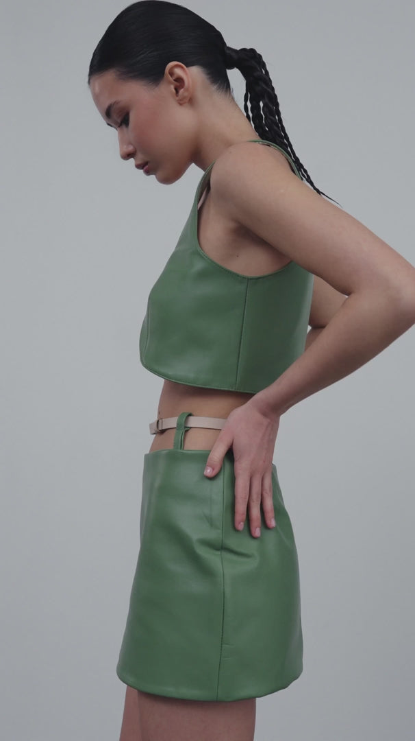 Мініспідниця з натуральної шкіри у трендовому відтінку авокадо.